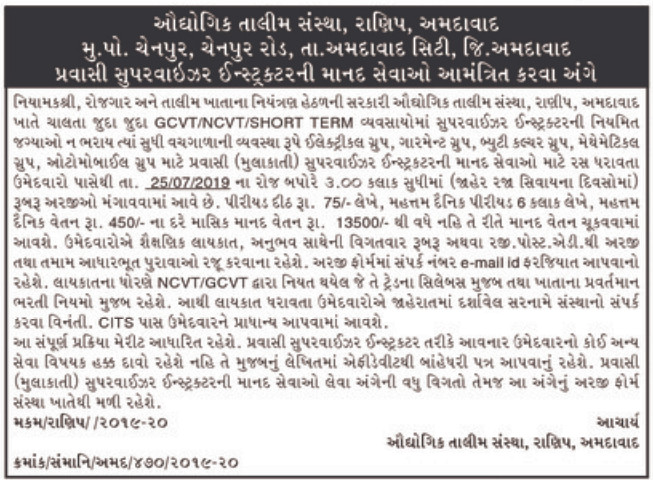 ITI Ranip Recruitment for Pravasi Supervisor Instructor Posts 2019