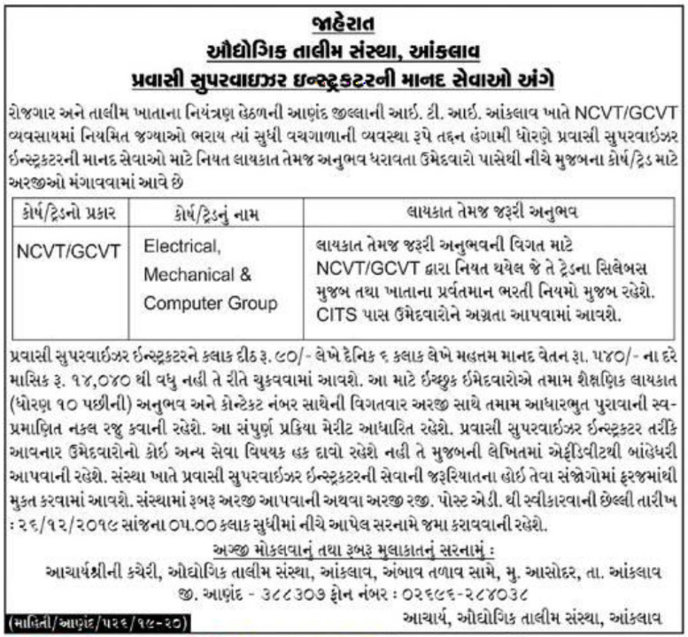 ITI Anklav Recruitment for Pravasi Supervisor Instructor Post 2019