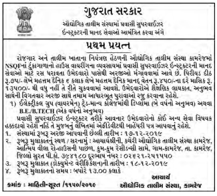 ITI Kamrej Recruitment for Pravasi Supervisor Instructor Posts 2019
