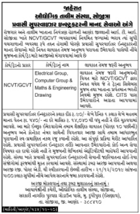 ITI Sojitra Recruitment for Pravasi Supervisor Instructor Posts 2019